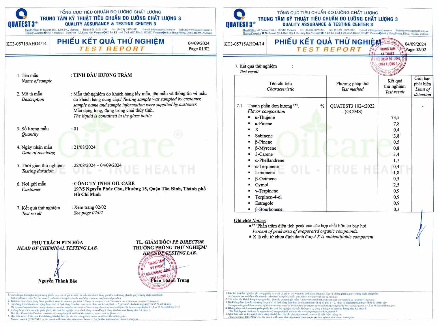 Tinh dầu luôn đạt chuẩn COA / MSDS / Test Quatest 3