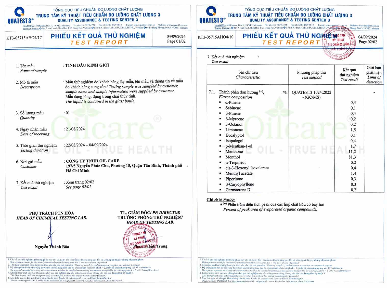 Xem chi tiết bảng kiểm nghiệm chất lượng Tinh Dầu Kinh Giới bán buôn mới nhất của QUATEST 3